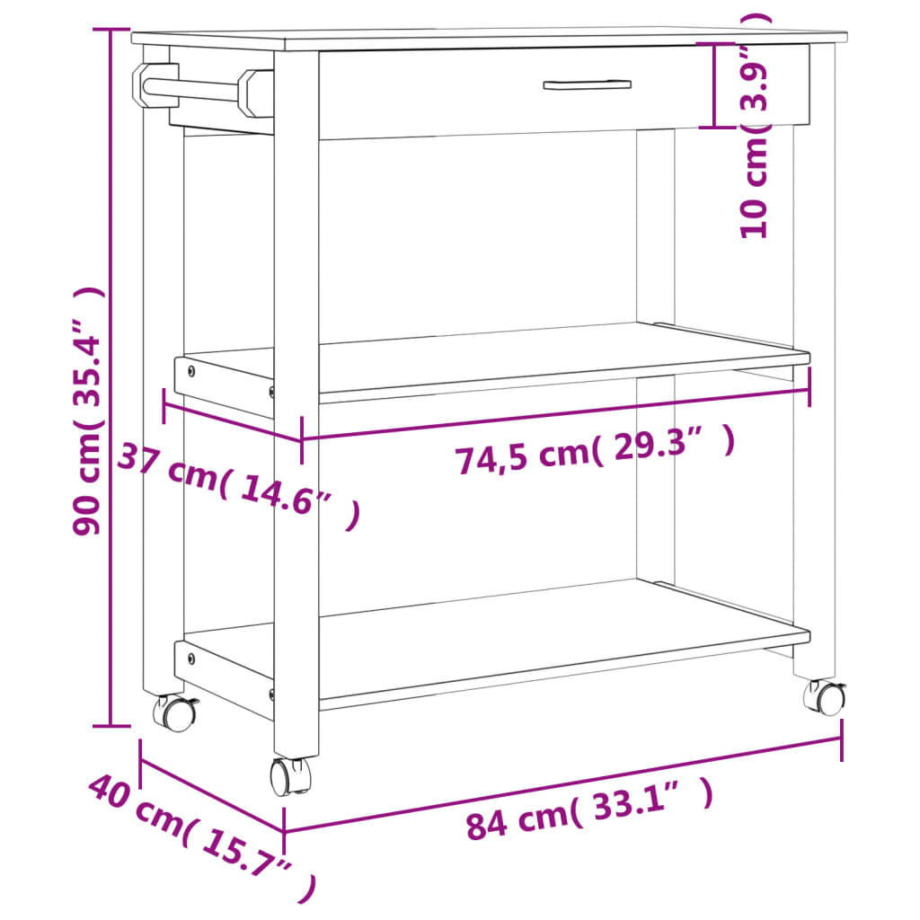 - Durable material: Solid pine wood is a beautiful natural material. Pine wood has a straight grain, and the knots give the material its signature, rustic look. Made of solid pine wood, this kitchen storage trolley is durable and sturdy.