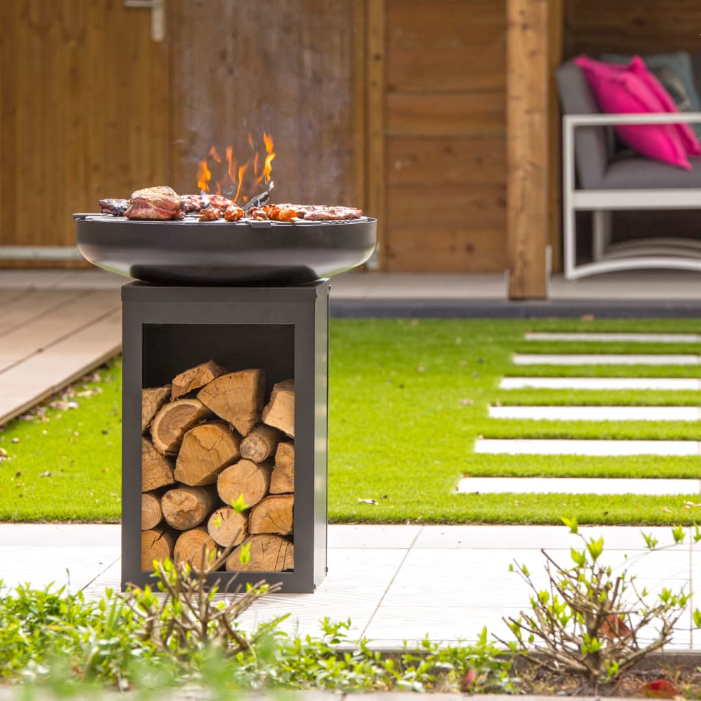 The multifunctional Matanzas outdoor plancha griddle from RedFire features a sleek and robust steel construction, a removable cast iron grill plate and a convenient wood logs storage.